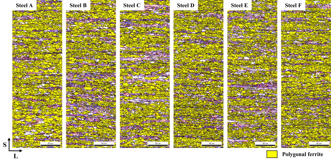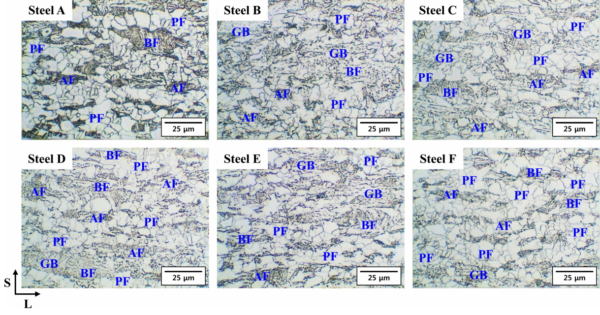 ferrite, AF), ๊ณผ๋ฆฝํ ๋ฒ ์ด๋์ดํธ(granular bainite, GB) ๋ฐ ๋ฒ ์ด๋์ดํธํ ํ๋ผ์ดํธ(bainitic ferrite, BF)