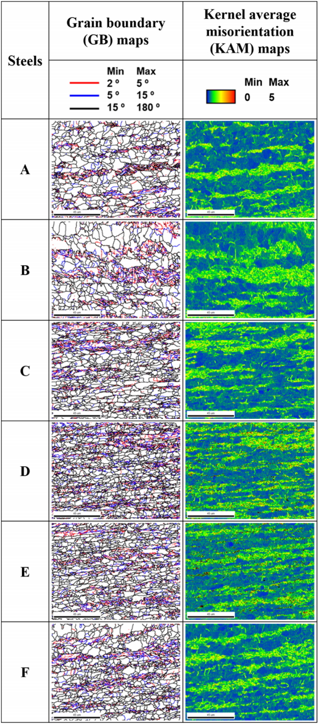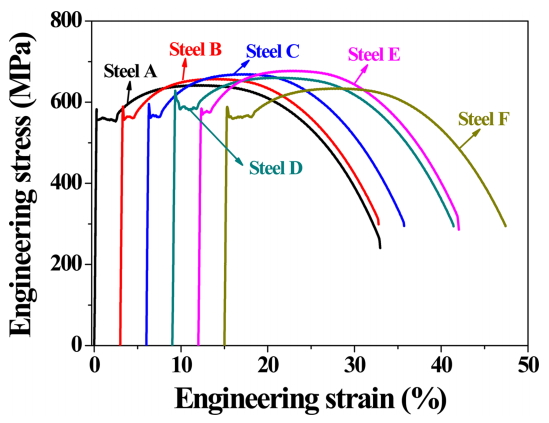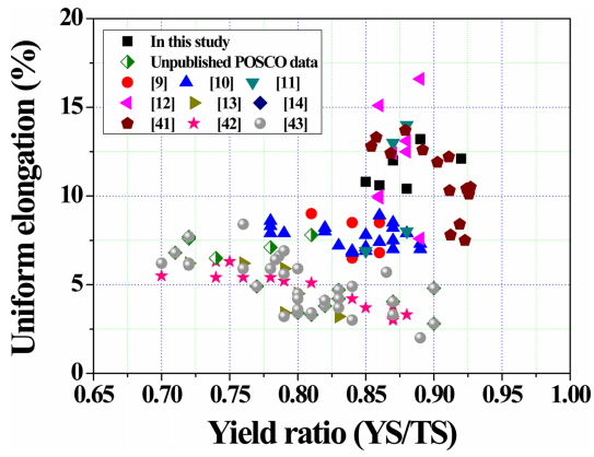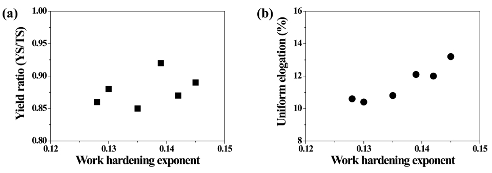 yield ratio (YR), uniform elongation (uEl), and work hardening exponent for the steels