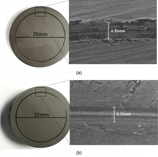 Photographs of wear tracks after ball-on-disc wear test: (a) M4 and (b) CPM15V.