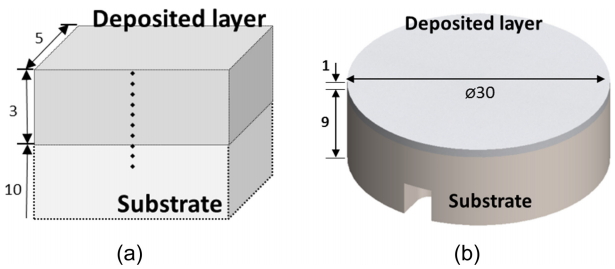Schematic representation of specimens for (a) hardness test and (b) wear test (unit:
