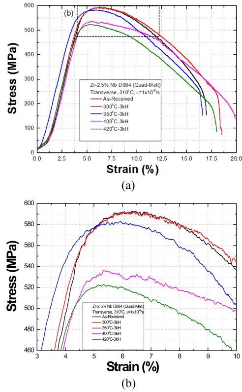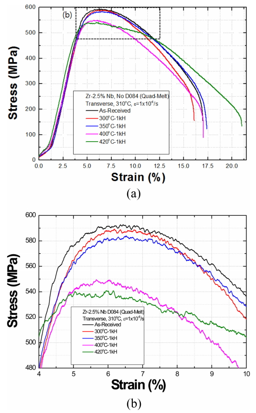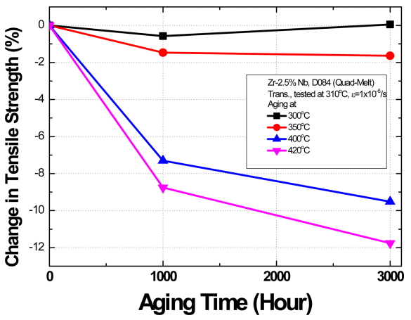 재료를 열적으로 시효 처리하여 outlet 온도인 310 ºC에서 압력관재료의 기계적 성질에 미치는 효과를 분석하였다. 아울러 변형 속도의 효과 및