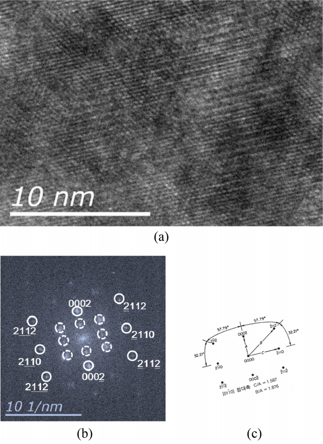 그림 5 (a)는 as-received Zr-2.5%Nb 합금의 고 분해능 TEM 미세조직으로 가장 뚜렷하게 좌우로 약간 기울어져 보이는 라인은 (0002)면이다.