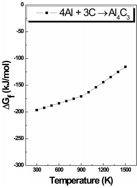 Where, ΔHf(Tiq)is formation enthalpy change of Al4C3 at 1050 ºC, Tad is adiabatic temperature, Tig is ignition temperature, and CPs(p) is heat capacity of Al4C3. Surface tension of molten Al continuously decreases with heating temperature [5]. This can enhance wettability of molten Al on graphite. The thickness of the interfacial
