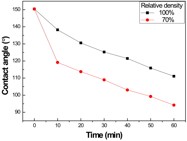 contact angle continuously decreases with heating time. Contact angle of molten Al