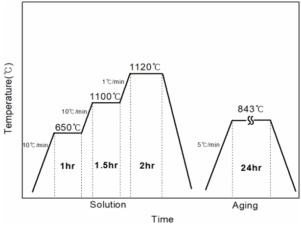 온도는 871 °C이다 [7]. 시험 온도는 실제 작동환경을 고려하여 870 °C(약 1600 °F)와 온도에 따른 거동을 파악하기 위해 그보다 100 °F 낮은 760 °C(1500