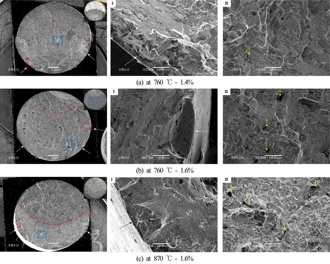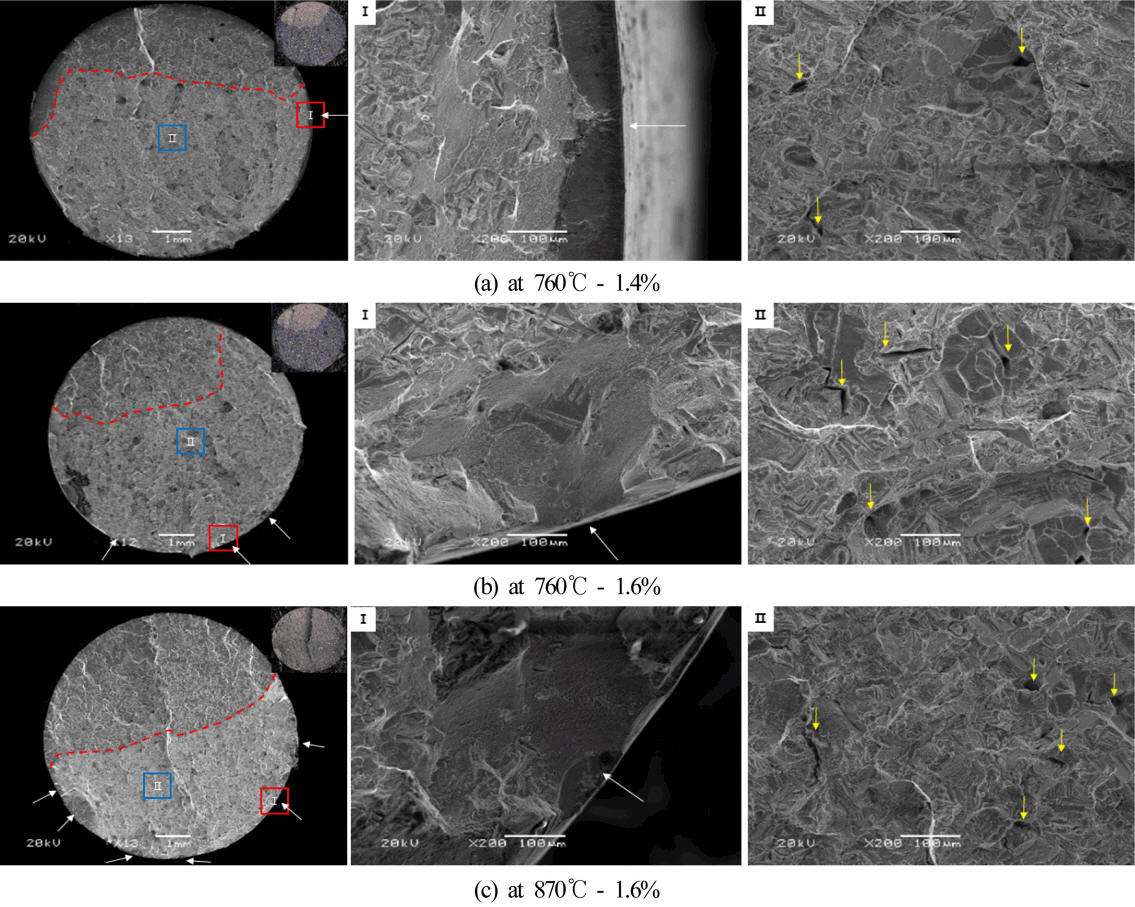 따라서 앞서 제시한 바와 같이 온도가 증가함에 따라 크리프의 효과 등으로 인한 소성변형량이 증가하기 때문에 피로수명은 870 °C에 비해 760 °C의