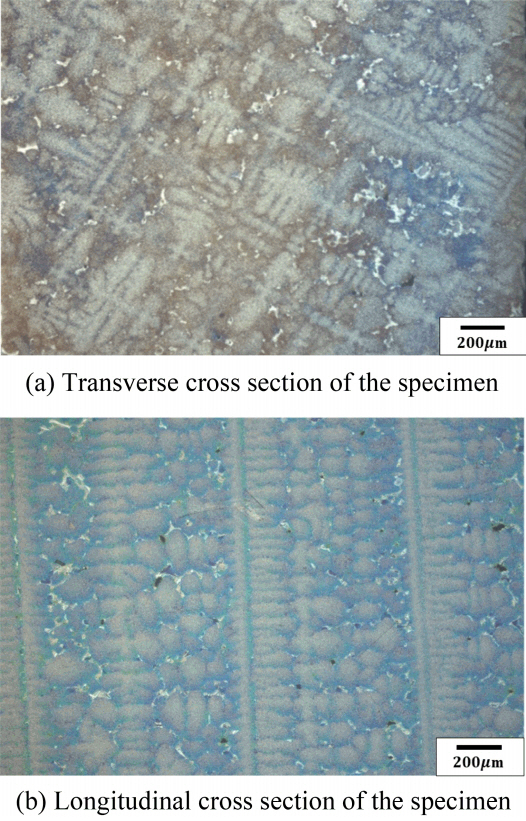 그림 3은 OM을 이용하여 관찰한 장시간 사용된 블레이드의 미세조직이다. 에칭조건은 20 ml의 질산(HNO3)과 80 ml의 염산(HCl)을 혼합한 용액을 사용하였다. 미세조직은 시편의 하중방향을 y축으로 설정하여 x축과 y축 단면을 관찰하였다. x축 단면을 살펴보면 주조 후 냉각을 통해 발생되는 dendrite가 관찰되었으며 y축 단면에서는 일방향으로 응고된 형상을 관찰되었다.
