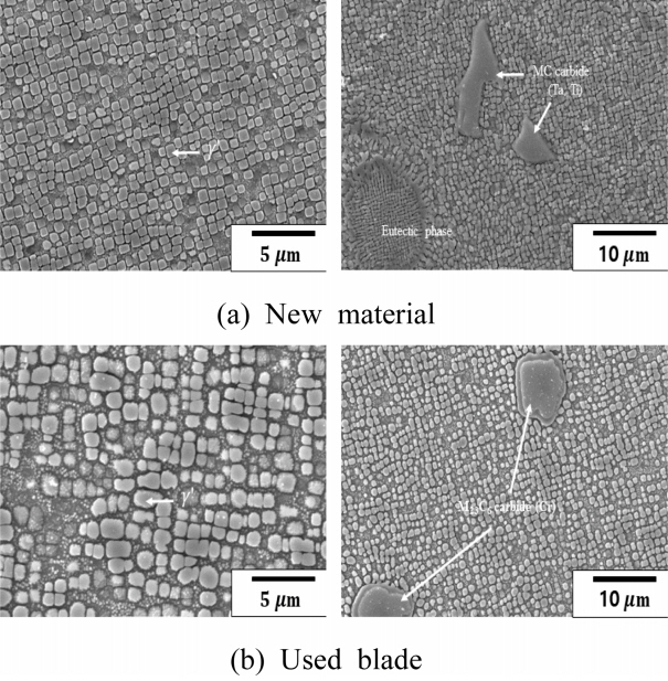 그림 4는 SEM을 이용하여 관찰한 운전하지 않은 신재와 장시간 사용된 블레이드의 미세조직이다. 신재에서는 입방형의 감마프라임상이 규칙적으로 배열되어 있으며,