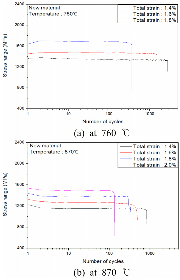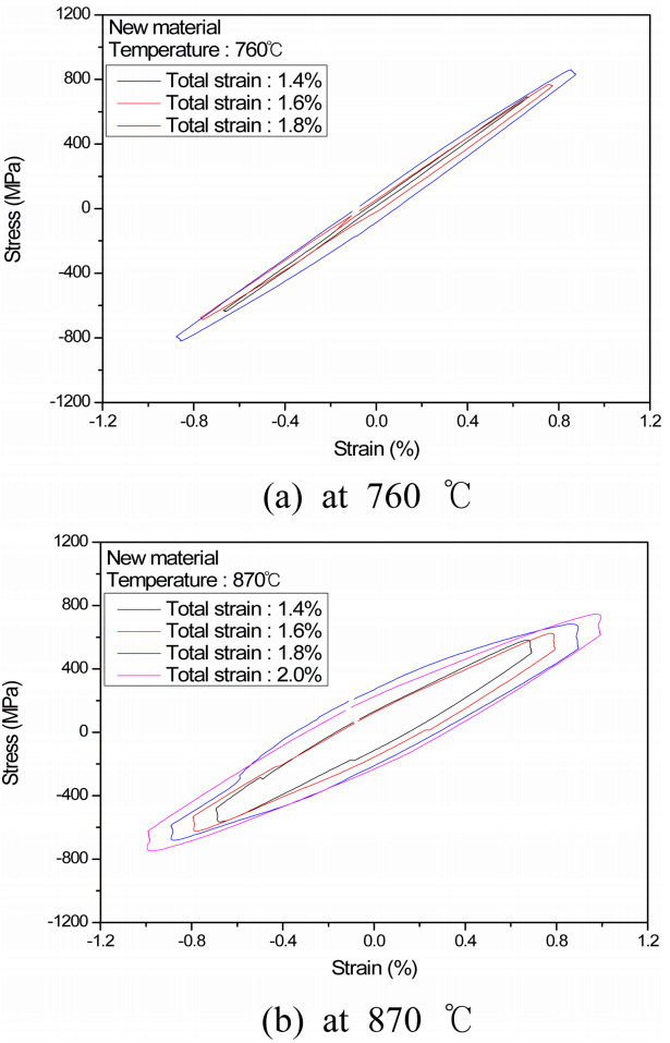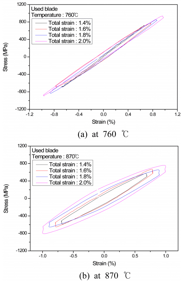 유사한 반복 거동을 보인다. 760 °C 조건에서는 피로 초기에 경화현상이 발생하고 정상상태를 유지하였다. 반면에 870 °C의 경우에는 초기에 연화현상을