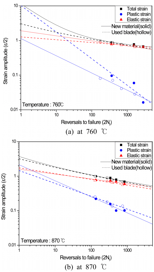 Coffin-Manson 식은 파단수명의 반주기에서 전변형률, 탄성변형률, 소성변형률이 사용된다. 그림 9는 온도에 따라 운전하지 않은 신재와 장시간 운전한 블레이드 소재에 대한 파단수명에서의 전변형률, 탄성변형률, 소성변형률을 나타낸 것이다. Coffin-Manson