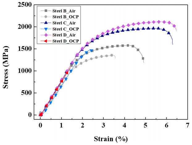 세 시편 모두 대기 중에서 측정된 연신율 및 항복강도 대비, 용액에 침지된 조건에서 측정된 연신율 및 항복강도 값이 현저히 낮은 것으로 확인되었다.