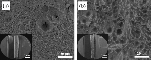 SEM images showing the fracture surfaces of steel B after SSRT tests: (a) in air,