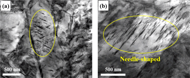 μm)의 순서로 확인되었다. 그림 5는 TEM을 통해 관찰된 이미지로, T 처리 후 마르텐사이트 기지 내에 있던 C가 약 100~200 nm 크기의 침상형의 Fe2.4C 형태로 석출되어 분포함을 짐작할 수 있다. Speich [22]가 지적한 바와 같이, 미세 침상형태를 가진 Fe2.4C의 TEM spot pattern을 정확히 확인하기는 힘들지만, 일반적으로 탄소강을 수냉 이후, 200 ºC 및 그 이하의 온도에서 템퍼링 할 경우,