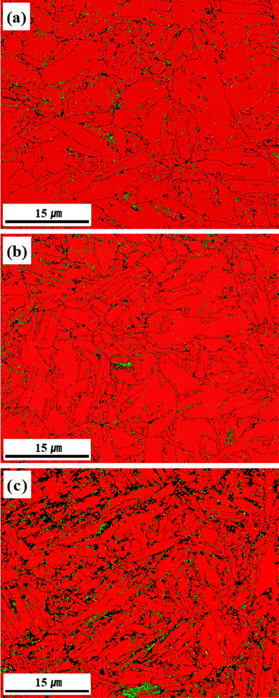 microstructures of (a) steel B, (b) steel C [20], and (c) steel D. Red-Ferrite; Yellow green-Fe2.4C; Blue-Fe3C.