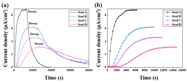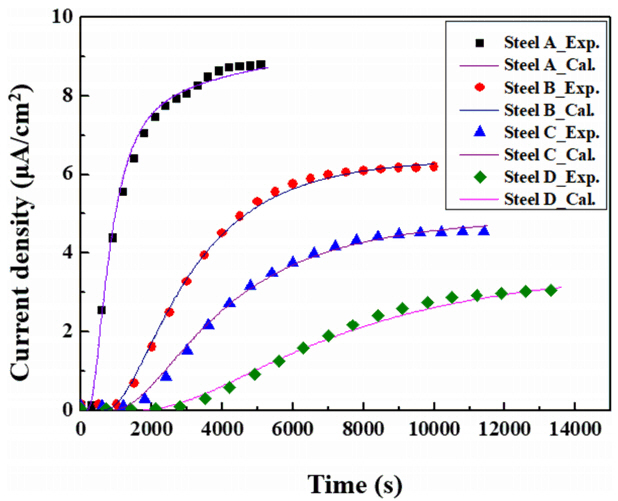 여기서 Dapp는 수소 확산 계수, L은 시편의 두께, tbt는 수소투과 전류가 선형적으로 상승하는 구간에 외삽하였을 때의 시간을 나타내고, JssL은 수소원자의 투과도, iss는 정상상태 (steady-state)일 때의 투과 전류 밀도, n은 반응에 참여한 전자수, F는 패러데이 상수를 나타내며, Capp 강재 내 수소원자의 용해도를 나타낸다.