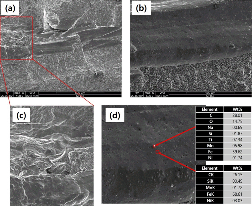 있다. 또한, (d)에서 보는 바와 같이, 파면에는 수많은 카바이드가 존재함을 알 수 있다. Cr-Mo강의 경우, 후열처리에 의한 HAZ부의 재열