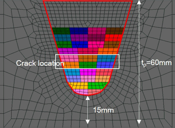 그림 17과 같이 재열 균열을 고려하여 내부 균열(embedded flaw)로 정의하였고, 그 외 용접부의 기계적 특성은 실험 결과를 그대로 반영하였다. 적합성