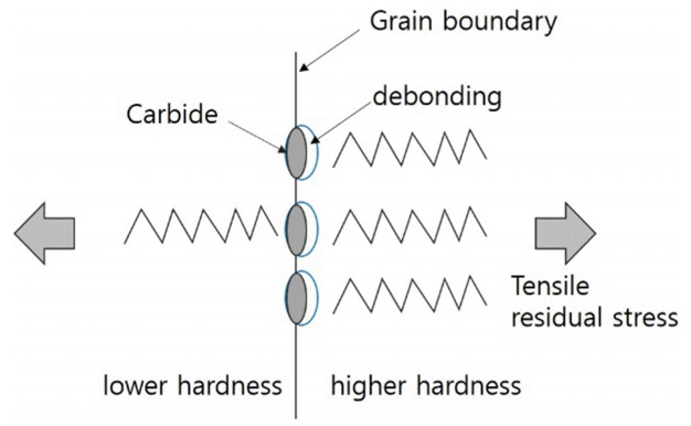 동일한 경우, 연한 조직대비 단단한 조직에서 입계의 카바이드와 주위 조직의 분리(debonding) 현상이 쉽게 발생되어 균열로 성장 가능성이 높게