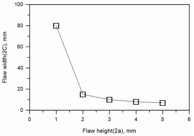 폭)가 기하적으로 감소함을 알 수 있는데, 1 mm 이내의 결함은 80 mm까지, 5 mm 크기(높이)인 경우 7 mm 결함 길이까지 허용 가능함을