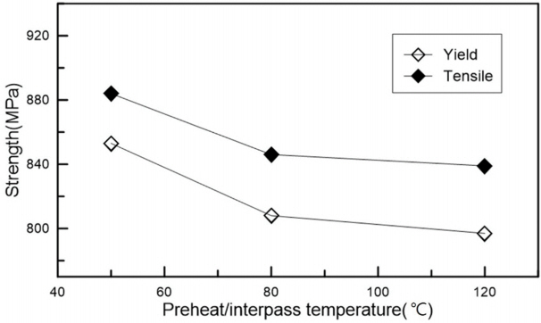 경화조직 형성을 억제하는 데 있다. 따라서, 예열/층간 온도가 증가함에 따라 강도는 감소하고, 인성은 증가하는 경향을 보인 것으로 판단된다.