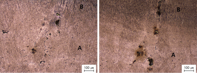 weld metal)까지 진전됨을 확인하였다. 또한, 재열 영역에 다수의 균열이 발생되어 있음을 확인하였고, 최대 크기는 1 mm 수준으로 성장되어
