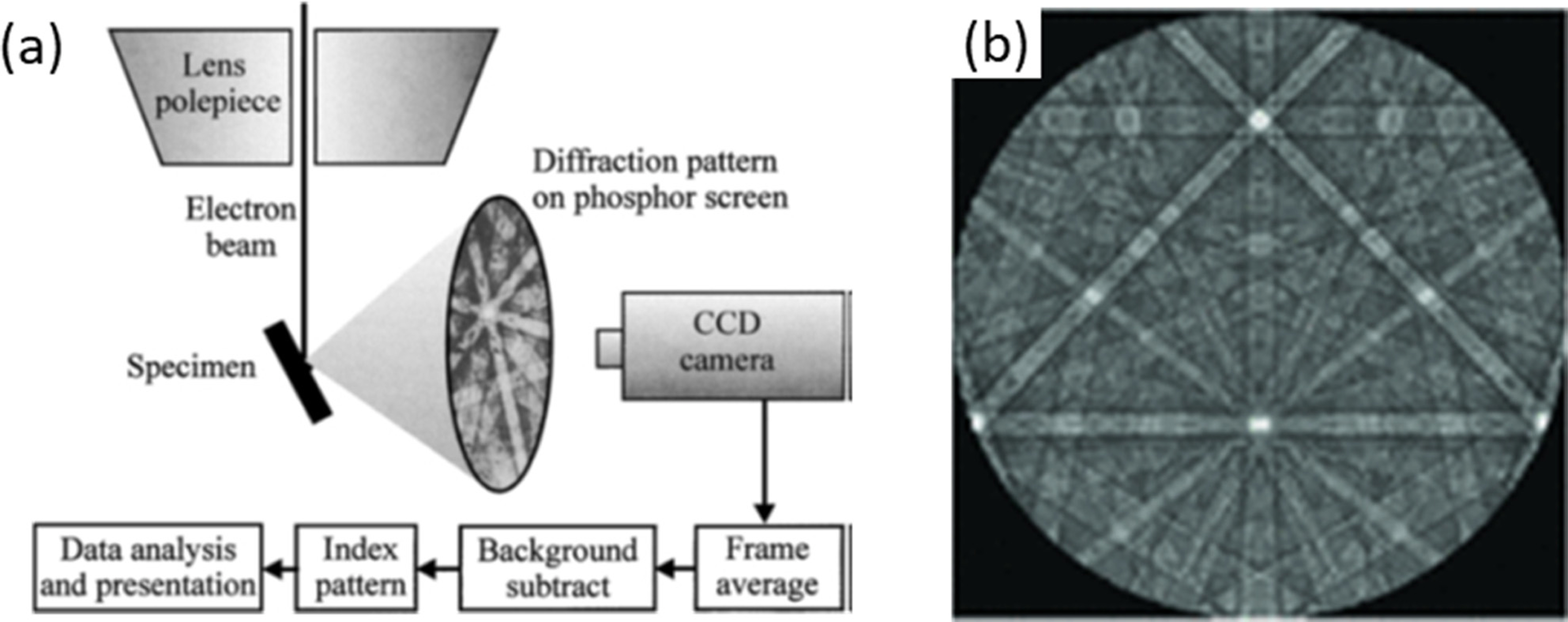 EBSD는 후방산잔전자의 회절 패턴을 이용한 분석 기술로 저조도 카메라를 이용한 EBSD 패턴 연구가 1954년 처음 소개 되었으며 [37], 근래에는 CCD (charge-coupled device) 카메라와 함께 미세 조직 분석에 적용되기 시작했다 [38]. 그림 2a는 전반적인 EBSD 시스템을 보여주는 모식도이며, 기존의 TEM과 같은 고 분해능의 분석에 비해 고른 격면을 가지는 상대적으로 간단한 시편 준비과정을