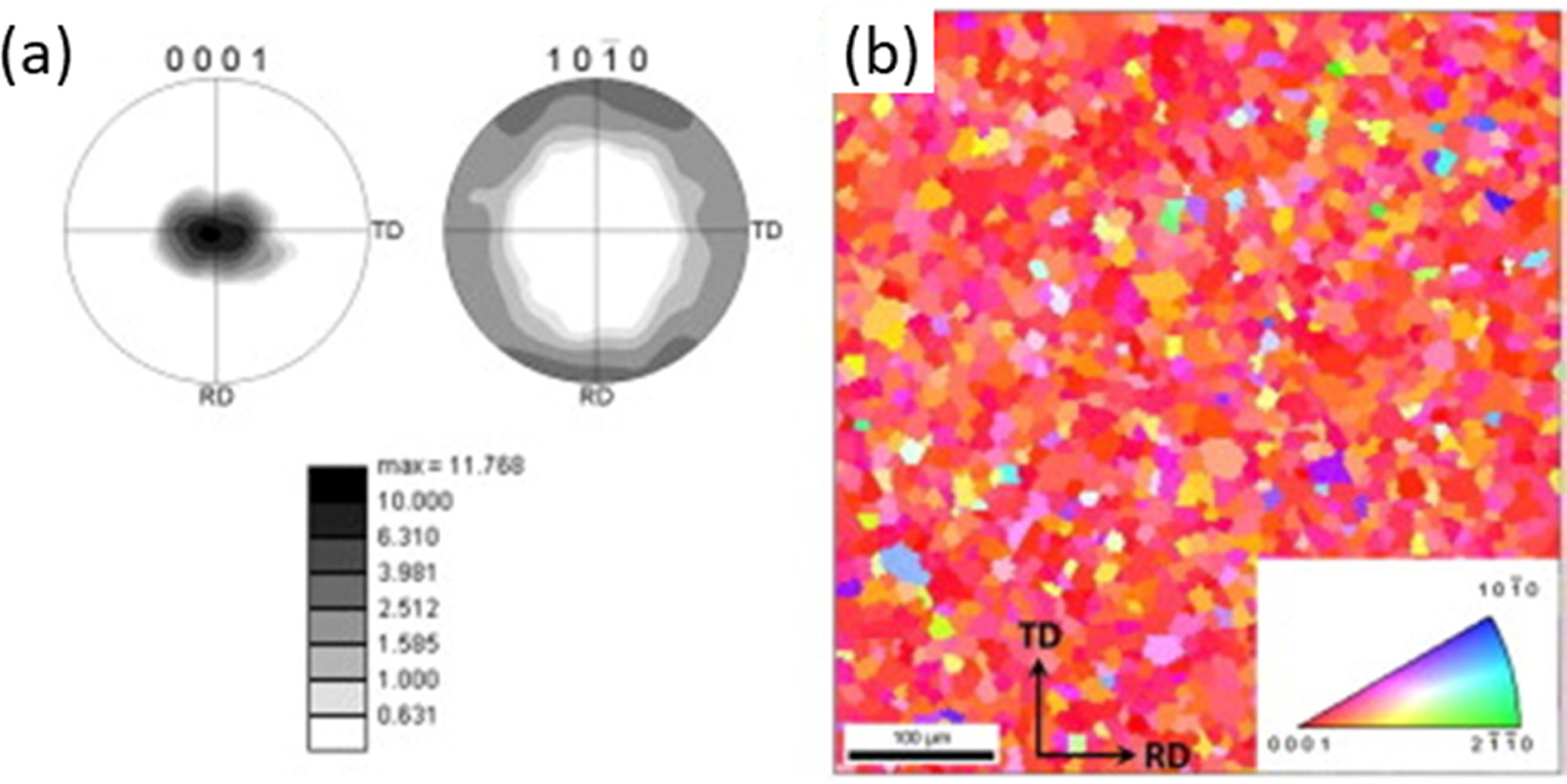 (a) Pole figure (PF) showing the initial texture and (b) inverse pole figure (IPF)