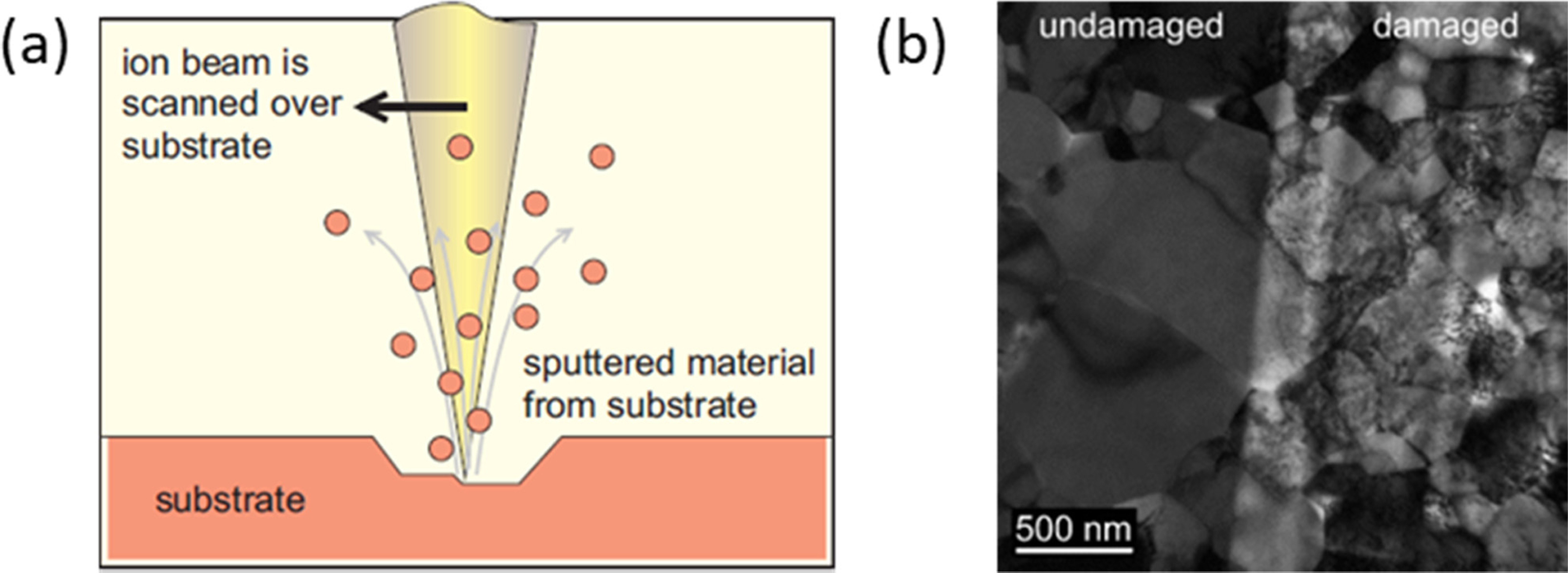 (a) A schematic of focused ion milling showing the sputtering process [42] and (b) bright-field TEM micrograph of the Cu film showing undamaged (left) and