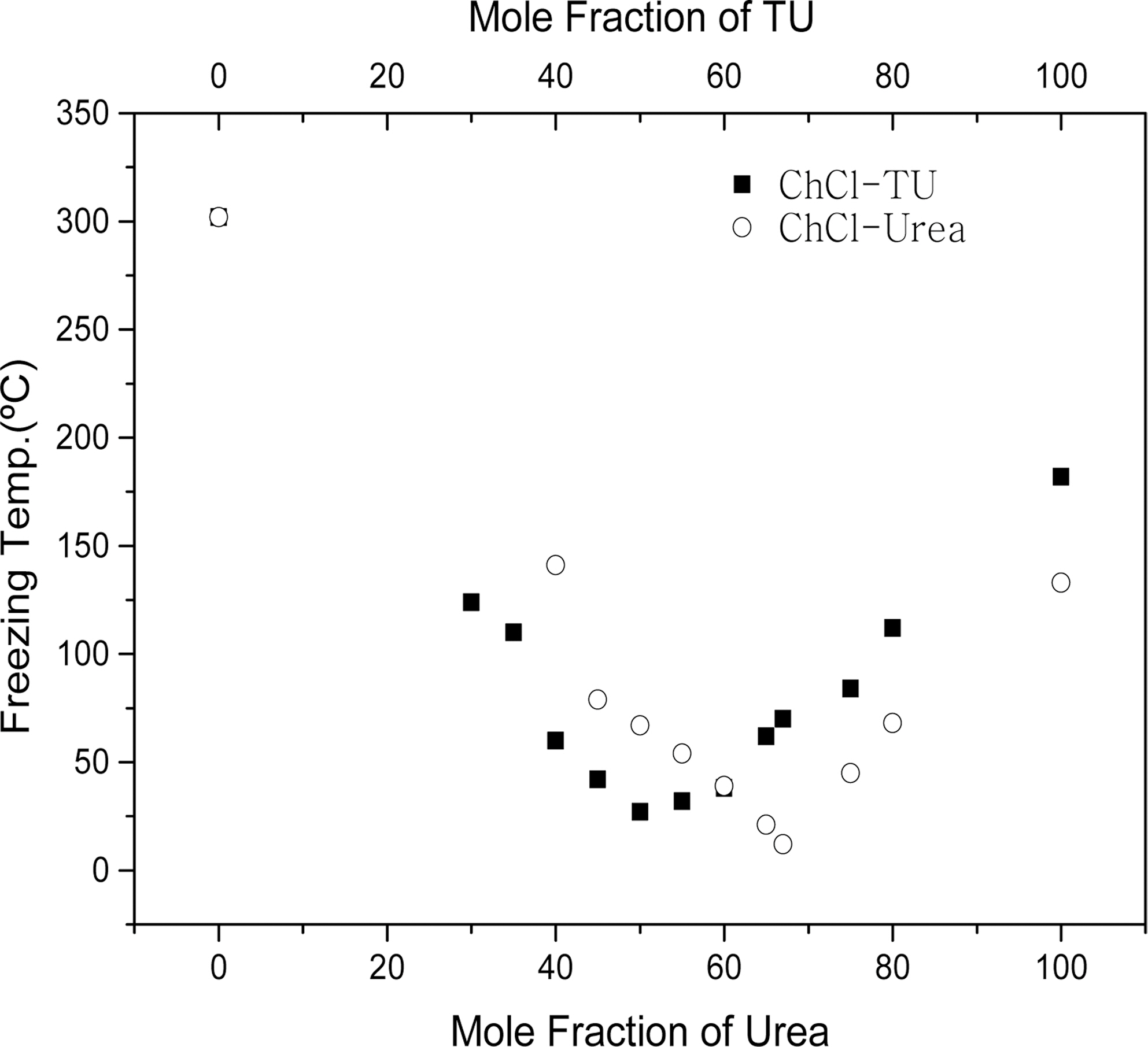 ChCl-U solution (solid), Dimethylthiourea in ChCl-TU solution (triangle), Thiourea