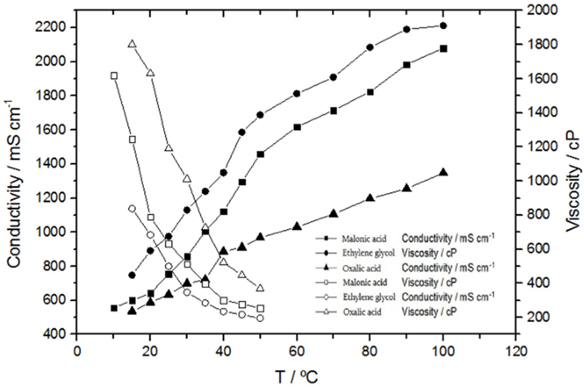 Conductivity and viscosity of additives in a IL(ChCl-TU) as a function of temperature.