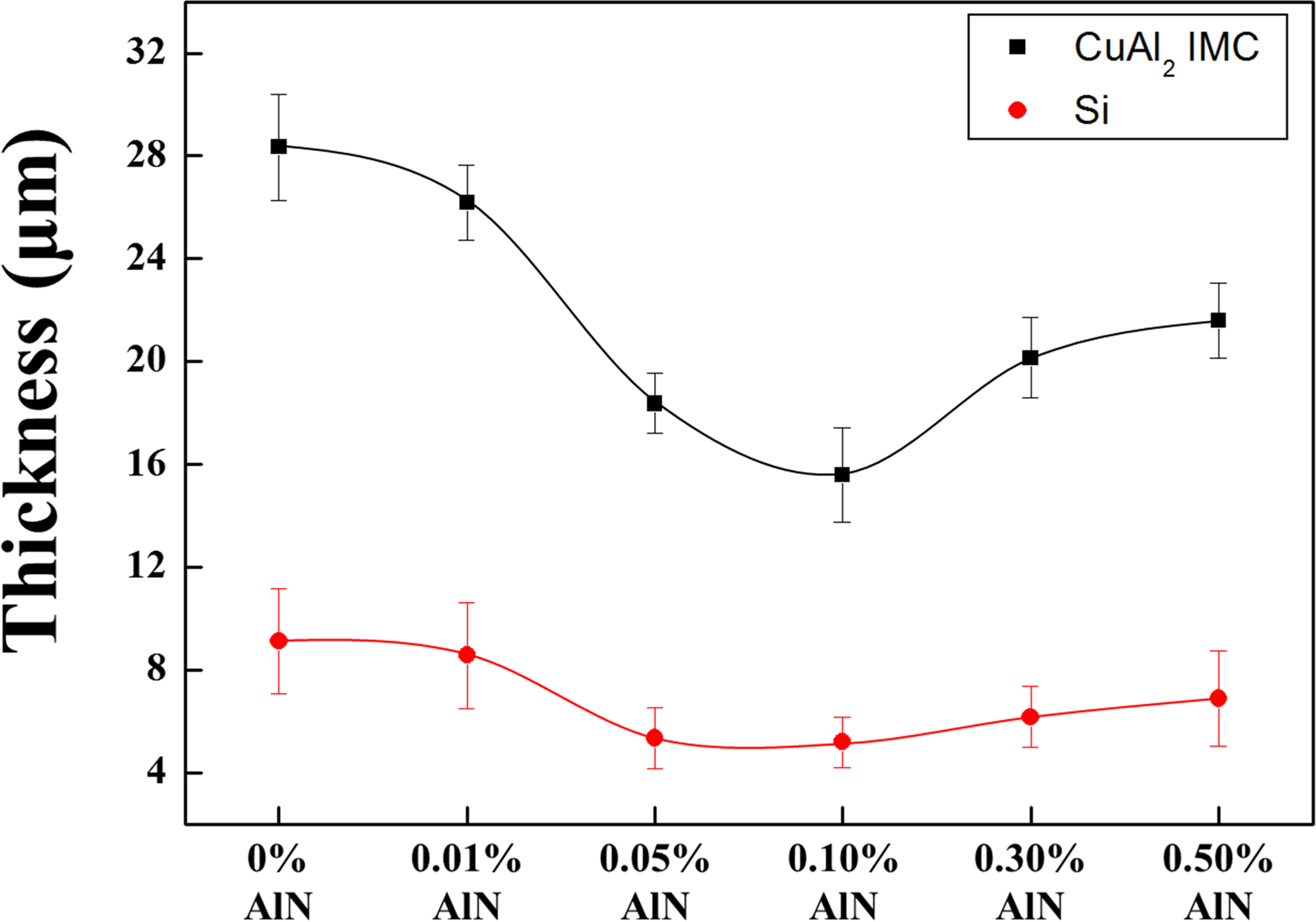 On the other hand, the mean thickness of both CuAl2 and Cu9Al4 IMCs using a 0.10% AlN-reinforced filler on the Cu substrate were 126.17 and 4.71