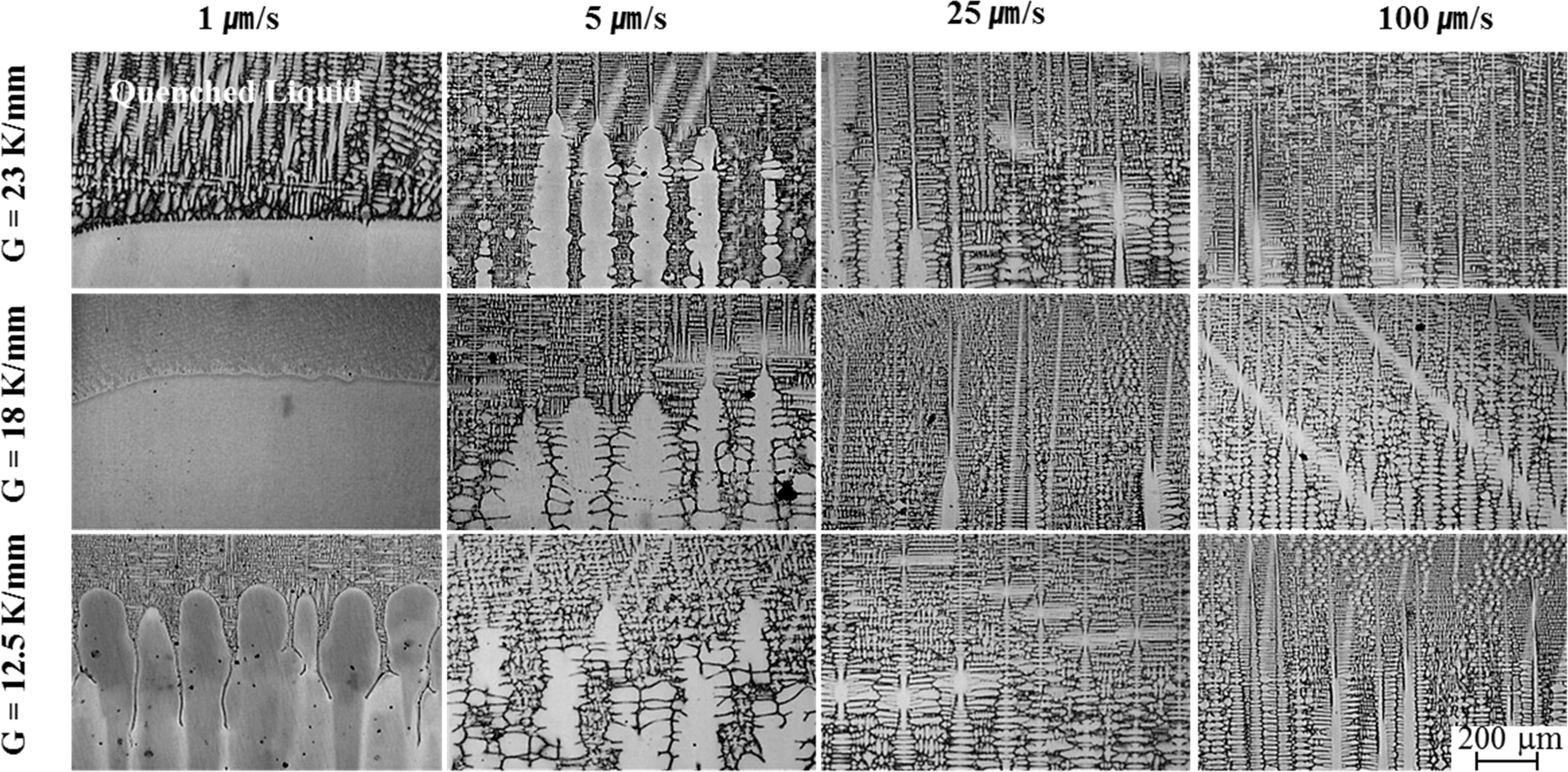 의해서 계면 형상에 의해서 구분이 가능한데,2차 수지상은 응고속도가 5 μm/s 이상의 조건에서 형성되는 것을 그림 2에서 확인할 수 있다. 온도경사 12.5, 18, 23 K/mm 조건에서 5 μm/s 이상의 응고속도에서 2차 수지상 이 잘 발달한 것을 확인 할