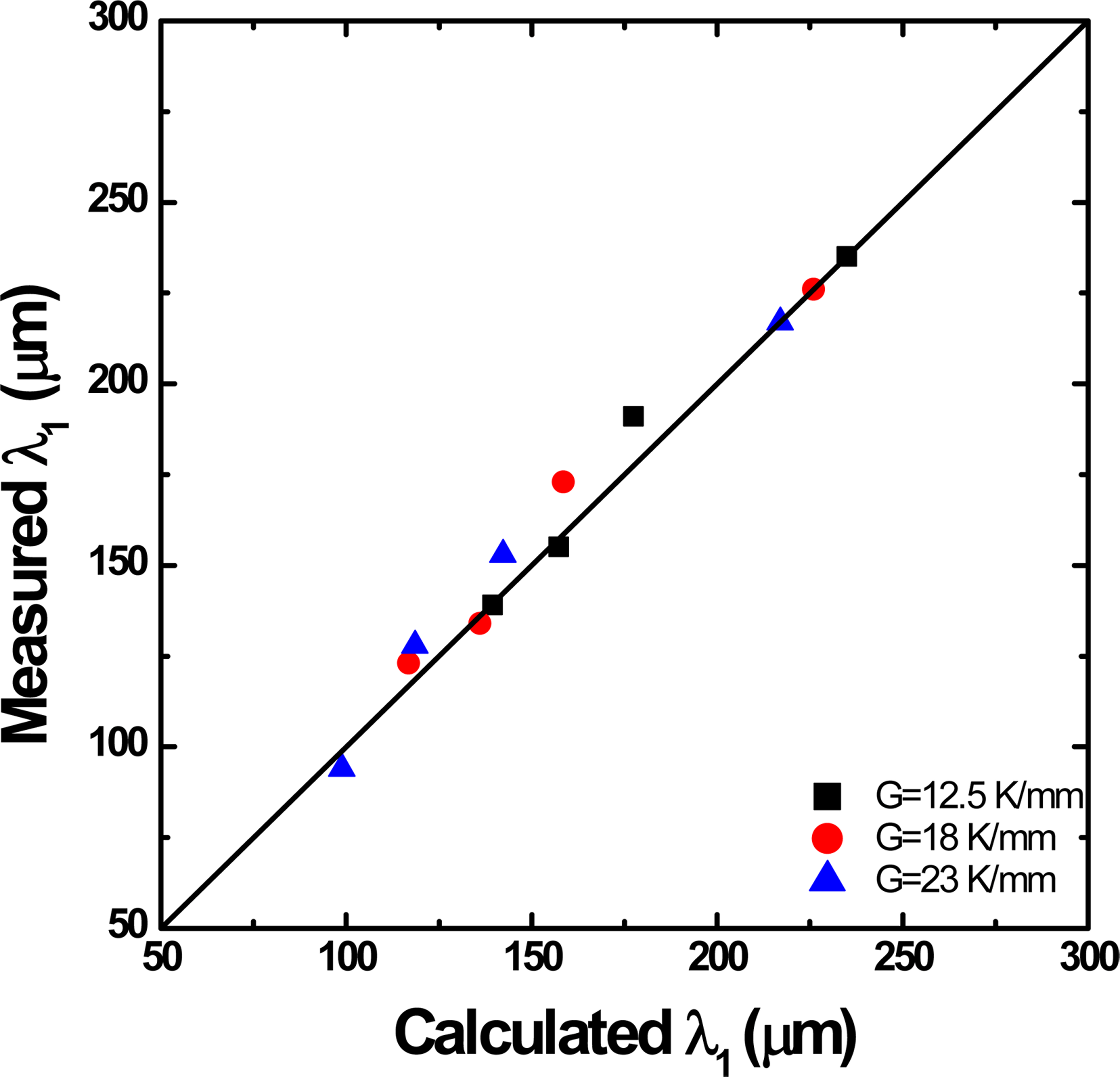 식의 의미는 본 실험 조건인 온도경사 범위 (12.5∼23 K/mm)와 응고속도 범위 (5∼100 μm/s)에서 임의의 온도경사와 임의의 응고속도에서의