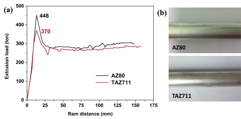AZ80 ํฉ๊ธ์ ์ต๋ ์์ถ ํ์ค์ 448 ton์ธ ๋ฐ๋ฉด, TAZ711 ํฉ๊ธ์ 370 ton์ผ๋ก AZ80 ํฉ๊ธ์ ๋นํด 18% ๋ฎ๋ค. ๋ํ, ๋น๋ ์ด ๋ค์ด๋ฅผ