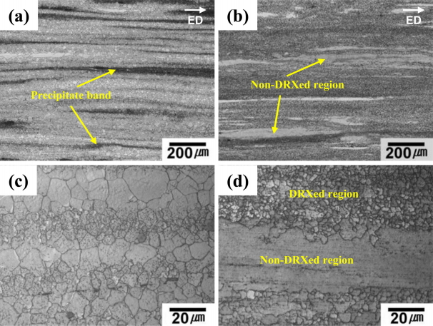 ์กฐ๋ํ ๋ฏธ์ฌ๊ฒฐ์ ๊ฒฐ์ ๋ฆฝ(non-recrystallized grain)๋ค์ด ์กด์ฌํ๋ค(๊ทธ๋ฆผ 3(b)). ๊ทธ๋ฆฌ๊ณ AZ80 ํฉ๊ธ์์๋ ๋์ ์์ถ๋ฌผ(dynamic precipitate)๋ค์ด ์์ถ ๋ฐฉํฅ์ผ๋ก ๊ธธ๊ฒ ๋ชจ์ฌ์๋ ์์ถ ๋ฐด๋(precipitate