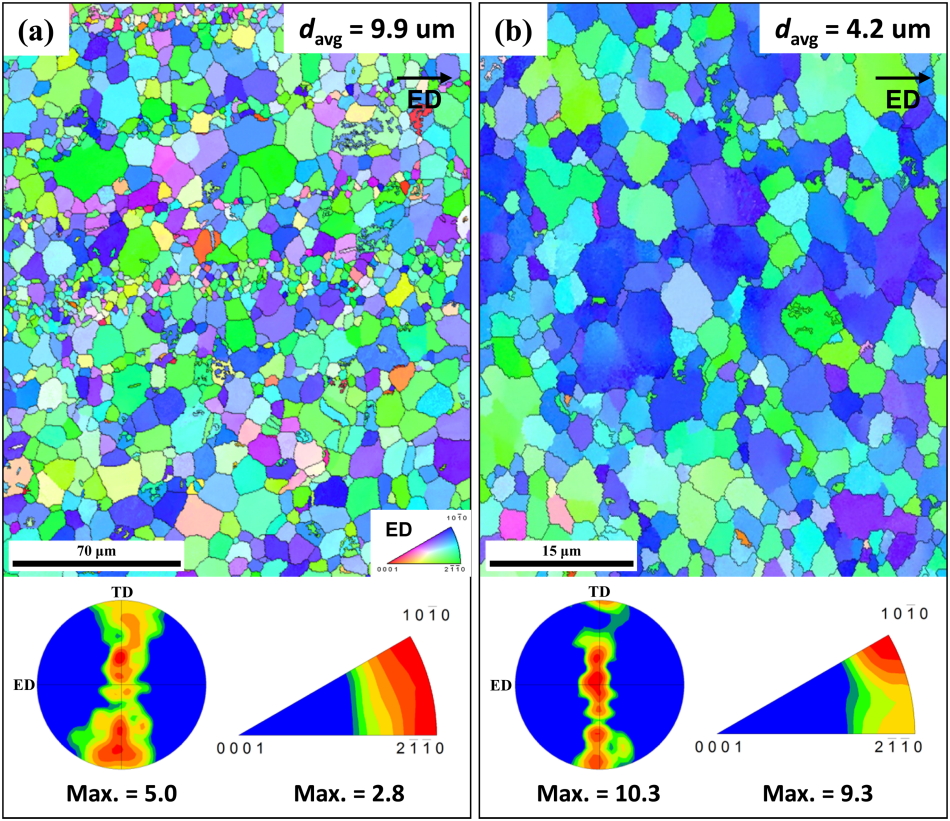extruded (a) AZ80 and (b) TAZ711 alloy. davg denotes the average grain size.