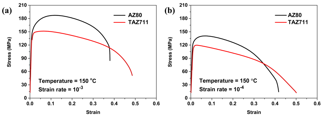Room temperature tensile stress-strain curves of extruded AZ80 and TAZ711 alloys.