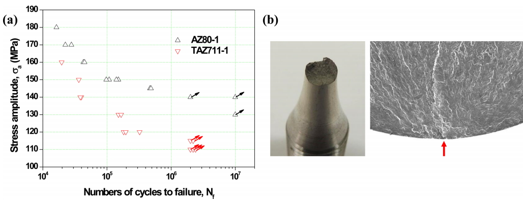 (a) High-cycle fatigue test results (S-N curves) of extruded AZ80 and TAZ711 alloys