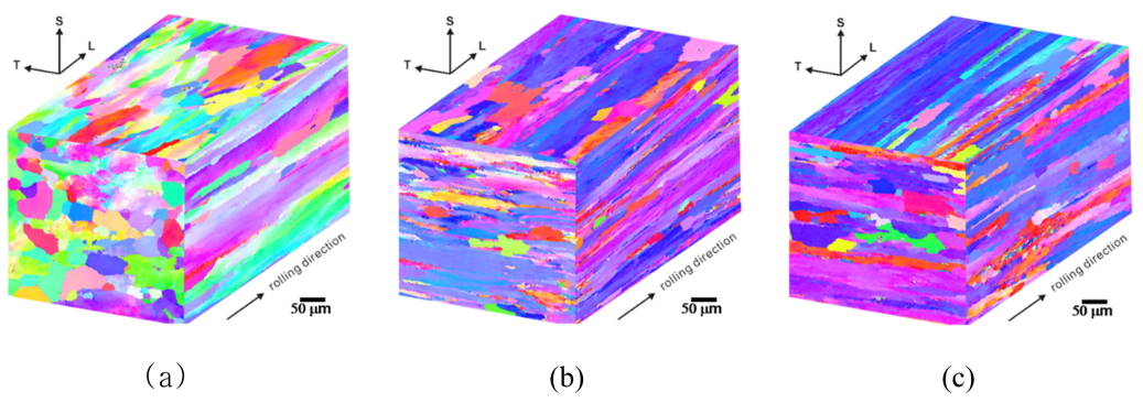 3.5% 염수 환경에서의 SCC 저항성을 측정하였다. 각 합금의 화학성분을 표 1에 나타내었다. 각 합금의 미세조직 관찰을 위해 연마 후, 켈러 용액(95 ml H2O + 2.5 ml HNO3+ 1.5ml HCl + 1ml HF)을 이용하여 에칭하였다. 그림 1은 EBSD를 이용하여 관찰한 (a) 7050-T7451, (b) 7475-T7351 및 (c) 7140-T7451 합금의 미세조직을 보여주고 있다.