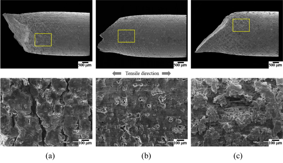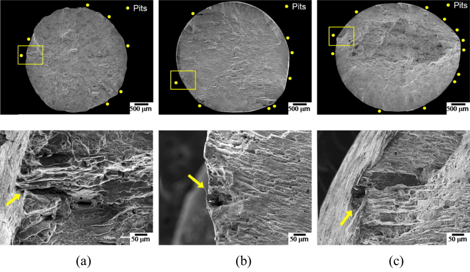그림 5와 6은 각각 일정하중 시험 후 (a)7140-T7451, (b)7475-T7351 및 (c)7050-T7451 시편의 파면(그림 5)과 파단면 근처의 표면(그림 6)을 SEM을 이용하여 관찰한 사진을 보여주고 있다. 그림 5의 저배율과 고배율 파면 관찰에서 보는 바와 같이 봉상 시편의 중앙부에서 파단이 시작되는 일반적인 인장 파면과는 달리 세 합금 모두 피팅 형태의 부식
