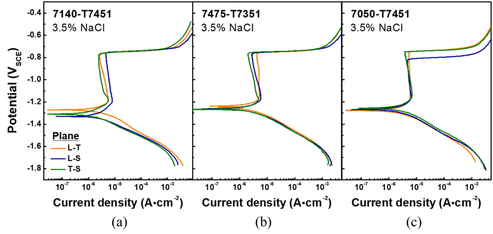 손상의 정도는 7050-T7451, 7475-T7351, 7140-T7451의 순으로 나타났다. 그림 7은 3.5% NaCl 용액에서 (a)7140-T7451, (b)7475-T7351 및 (c)7050-T7451 합금의 양분극 곡선을 보여주고 있다.