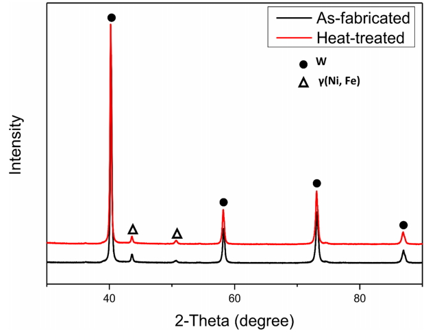 초기 소재 및 열처리된 소재의 XRD 상 분석 결과를 그림 2에 나타내었다. 두 소재 모두 W 상과 γ(Ni, Fe) 상으로 구성된 2 상 복합 소재(composite)임을 알 수 있었으며, W 상과 γ(Ni,