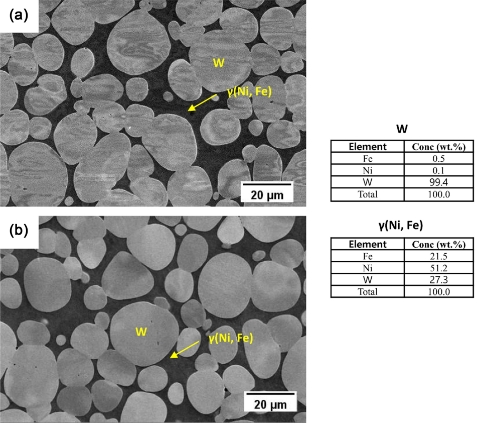 그림 3은 MIM 공정으로 제조된 W-7Ni-3Fe 합금의 SEM/EDS 관찰 결과이다. 여기서 (a)는 초기 소재, (b)는 열처리된 소재이다. 그림 3을 통해 두 소재 모두 조대한 결함은 관찰되지 않았으며 구형의 밝은 영역과 어두운 영역으로 구성되어 있는 것을 확인 할 수 있었다. 각각의 영역에