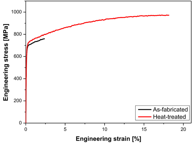 경우 항복 강도는 714.0 MPa, 최대 인장 강도는 960.0 MPa, 연신율은 20.3%로 나타났다. 즉, 열처리 이후 강도 및 연신율의 인장