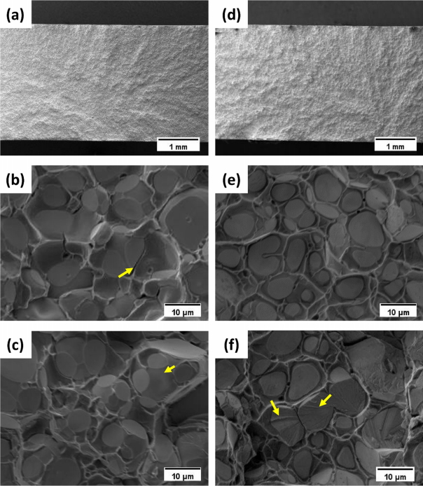 W-7Ni-3Fe 합금들의 열처리에 따른 변형 거동 차이를 알아보고자 인장 시험 후 파단면을 관찰하였으며 그 결과를 그림 6에 나타내었다. 먼저 파단면을 저 배율로 관찰한 결과 그림 6(a), (d) 두 소재 모두 조대한 결함은 존재하지 않았다. 파단면을 고 배율로 관찰한 결과 그림 6(c), (f) 초기 소재와 열처리된 소재들에서 공통적으로 γ(Ni, Fe) 상에서 연신된 특징을 확인 할 수 있었다. 그러나 초기 제조 소재의 경우 W 입자가