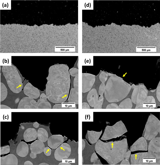 후 열처리가 W-7Ni-3Fe의 변형 거동에 미치는 영향을 보다 상세히 알아보고자 파단된 시편의 단면을 관찰하였으며 이를 그림 7에 도시하였다. 여기서 그림 7(a), (b), (c)는 초기 소재 파단면의 단면이며 그림 7(d), (e), (f)는 열처리된 소재의 단면이다. 관찰 결과 초기 소재의 경우 주된 균열이 W 상과 γ(Ni, Fe) 상의 계면을 따라 진전되는 반면 열처리된 소재의