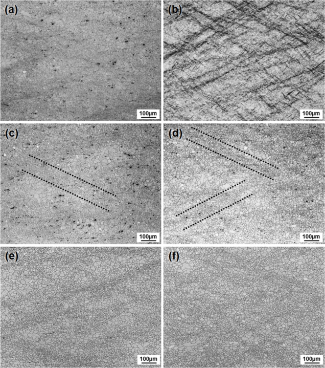 유사한 수준의 어닐링 후 결정립도를 얻을 수 있음을 주목할 필요가 있다. 또한 냉간 압연한 판재의 어닐링 후 미세조직은 전단 띠에서 재결정된 미세한