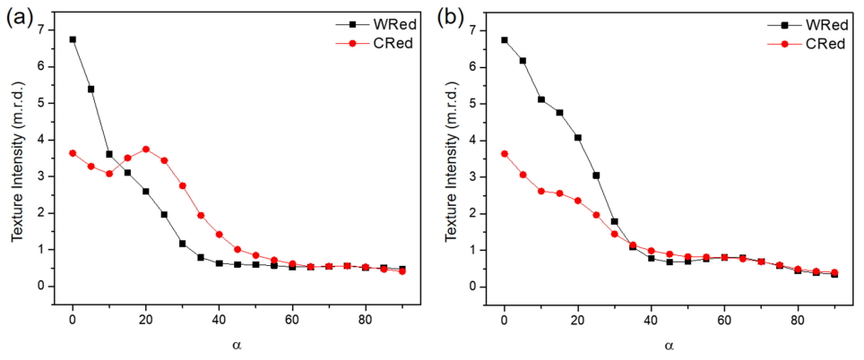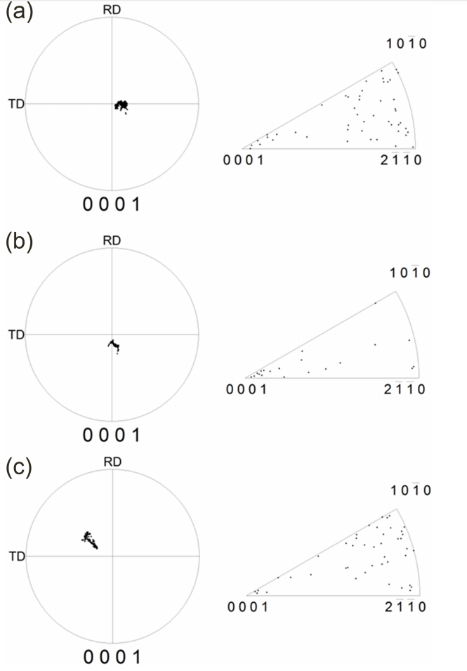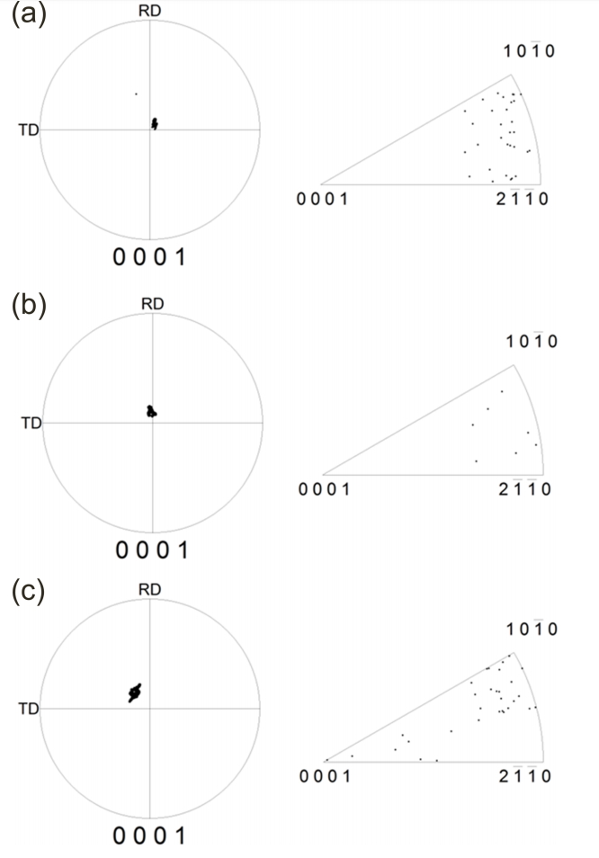 판재의 집합조직은 더 낮은 강도를 나타낸다. 이러한 경향은 그림 6에서 보다 명확히 관찰할 수 있다. 그림 6은 그림 2의 어닐링한 온간 및 냉간 압연 판재의 (0002)면 극점도로부터 ND에서 RD 혹은 TD 방향으로 기울어진 각도(a)에 따라 (0002)면의 극점도