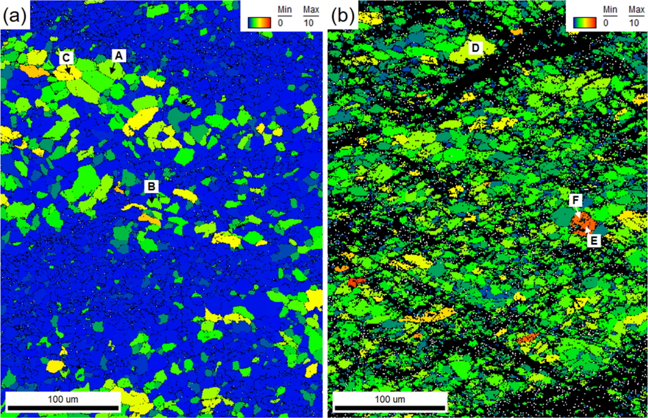 GOS maps of (a) warm-rolled and (b) cold-rolled AZ31 sheets. The data was converted