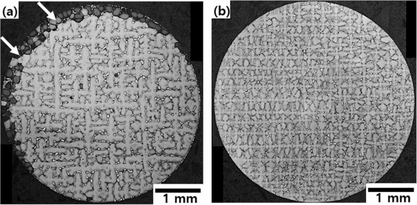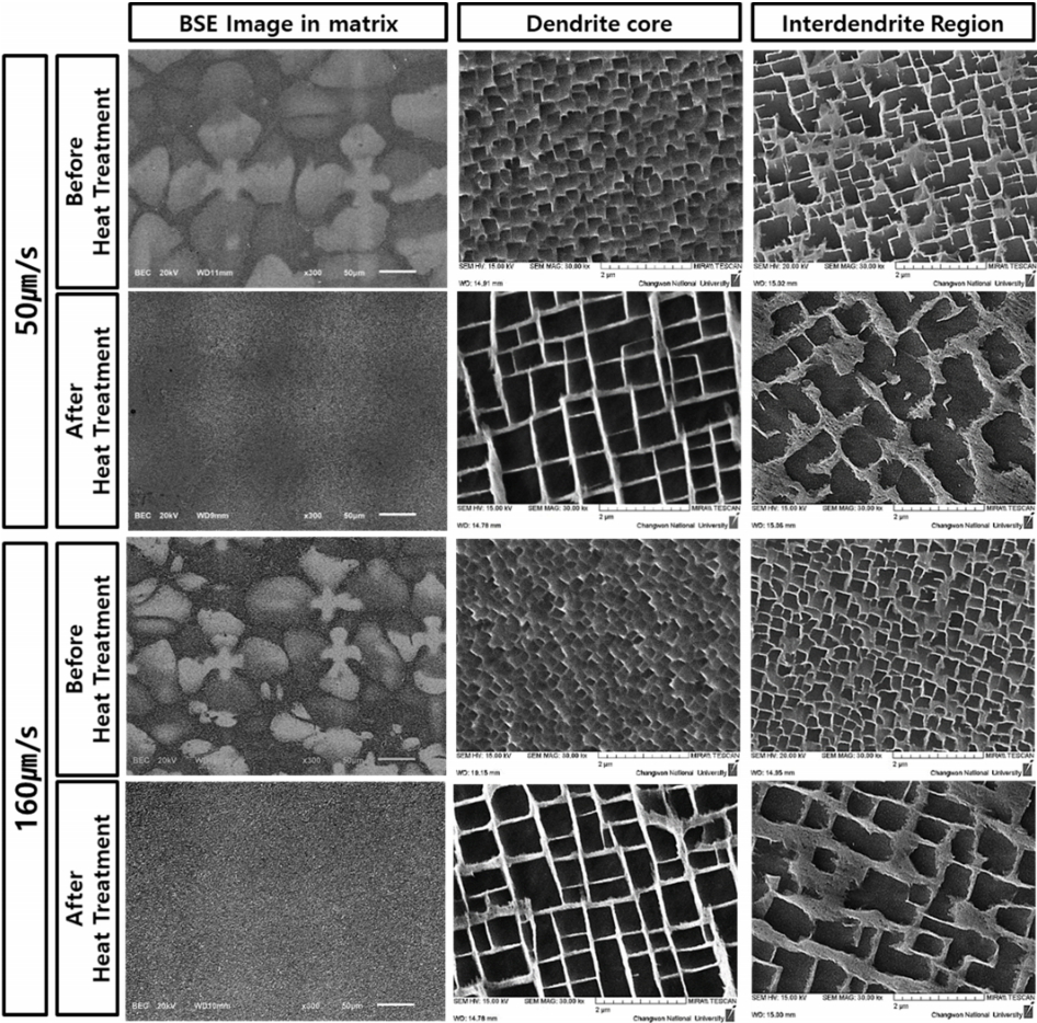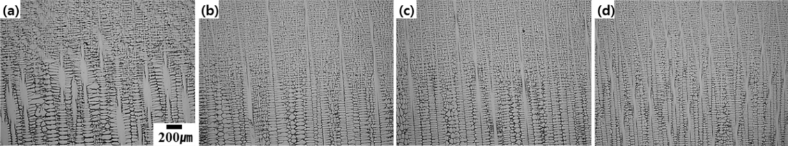 그리고 160 μm/s로 일정한 속도로 일방향 응고되었다. 각 응고 속도에서 응고된 시편을 길이 방향과 수직 방향으로 절단 및 연마한 후 Kalling’s